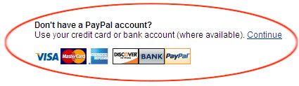 You do NOT need to have a Paypal account to charge this order to your credit card. If you are not a Paypal member, and do not WANT to be a Paypal member, just look for this area on the checkout page (and click CONTINUE): (This image is for illustrative purposes only)